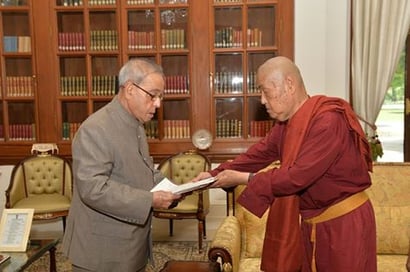 ※写真はムカルジー前大統領に陳情書を手渡す佐々井上人